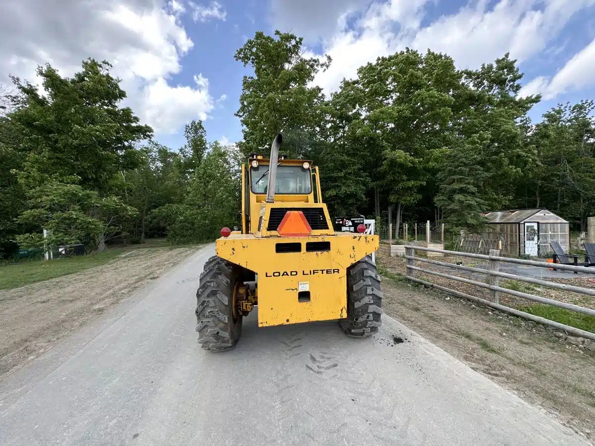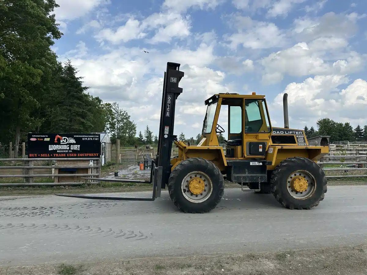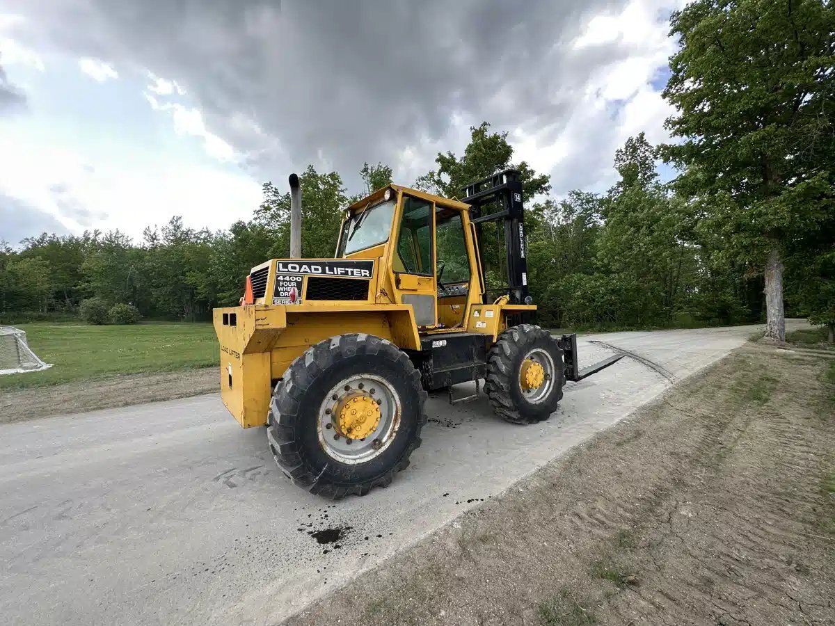 SOLD Very clean Load lifter 4400 with forks designed to fit into SeaContaiers pockets. 4 Cyl Perkins motor 4 wheel 2 wheel or Crab steering all in working condition. Cab with Working Heat, Brand new Roller bearings in Mast with Brand new 72" 10000 lbs forks 2 new Batteries. Additional front Hydraulics for attachments.