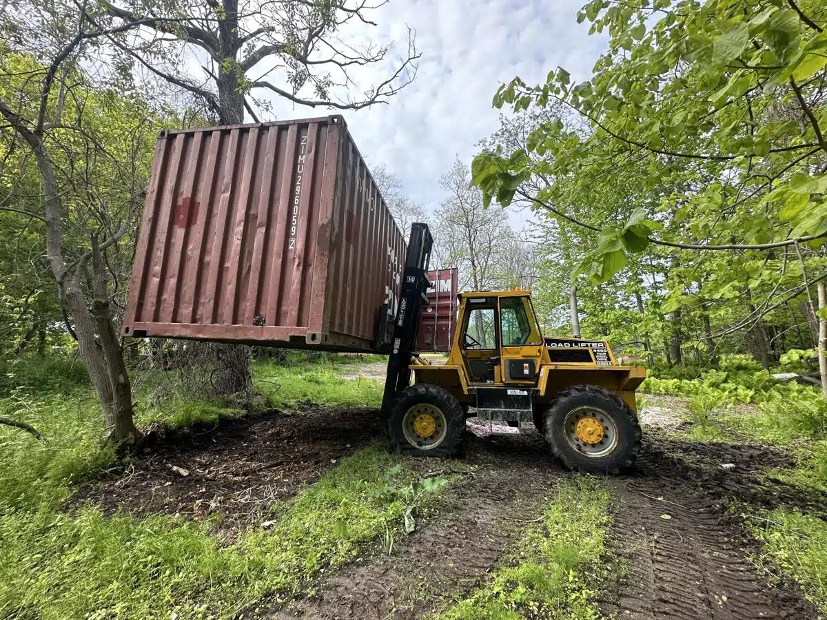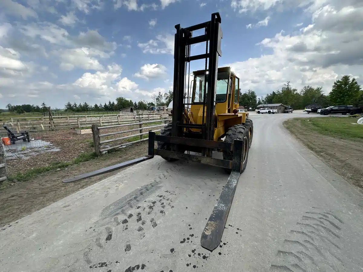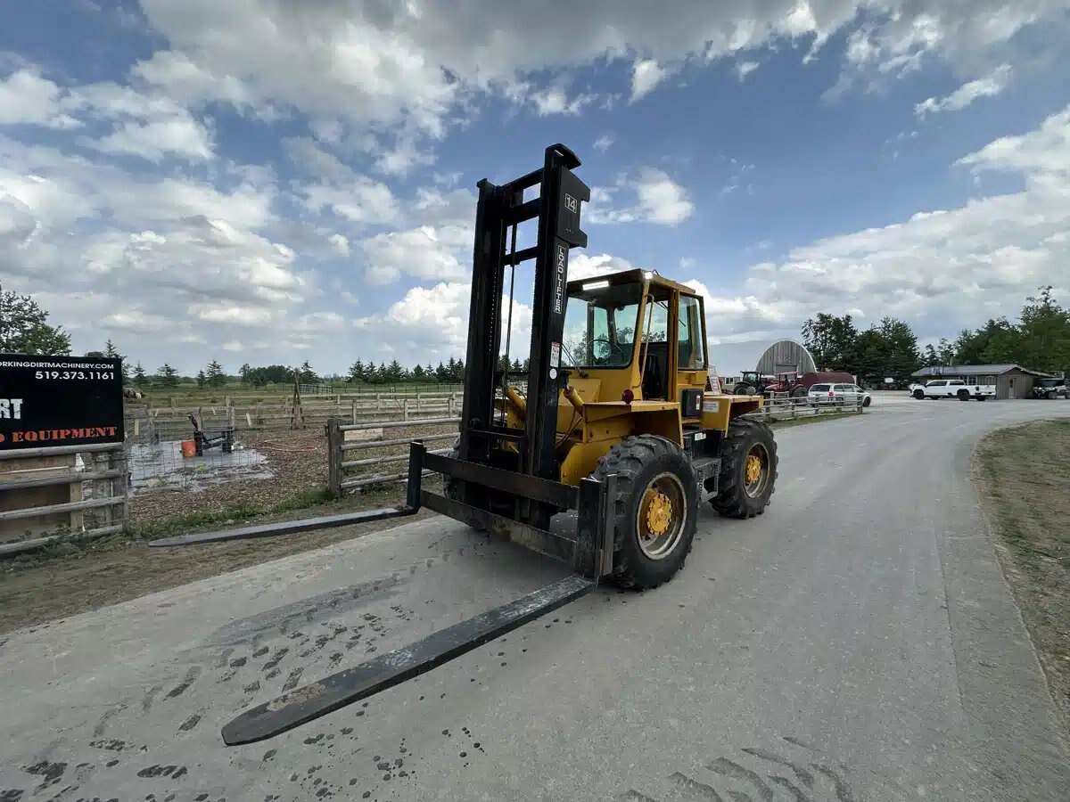 SOLD Very clean Load lifter 4400 with forks designed to fit into SeaContaiers pockets. 4 Cyl Perkins motor 4 wheel 2 wheel or Crab steering all in working condition. Cab with Working Heat, Brand new Roller bearings in Mast with Brand new 72" 10000 lbs forks 2 new Batteries. Additional front Hydraulics for attachments.