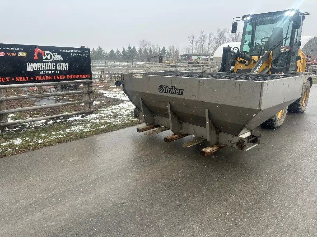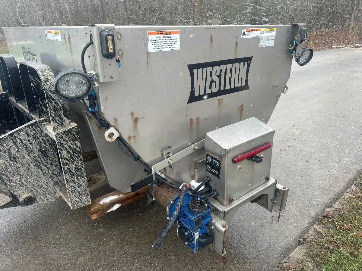 SOLD Western Stainless steel Stricker 9' 3 Yard Salt and sand Spreader Chain bottom. Unit was only used 2 seasons to the best of our knowledge.