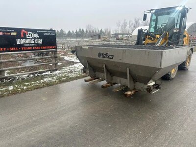 SOLD Western Stainless steel Stricker 9' 3 Yard Salt and sand Spreader Chain bottom. Unit was only used 2 seasons to the best of our knowledge....