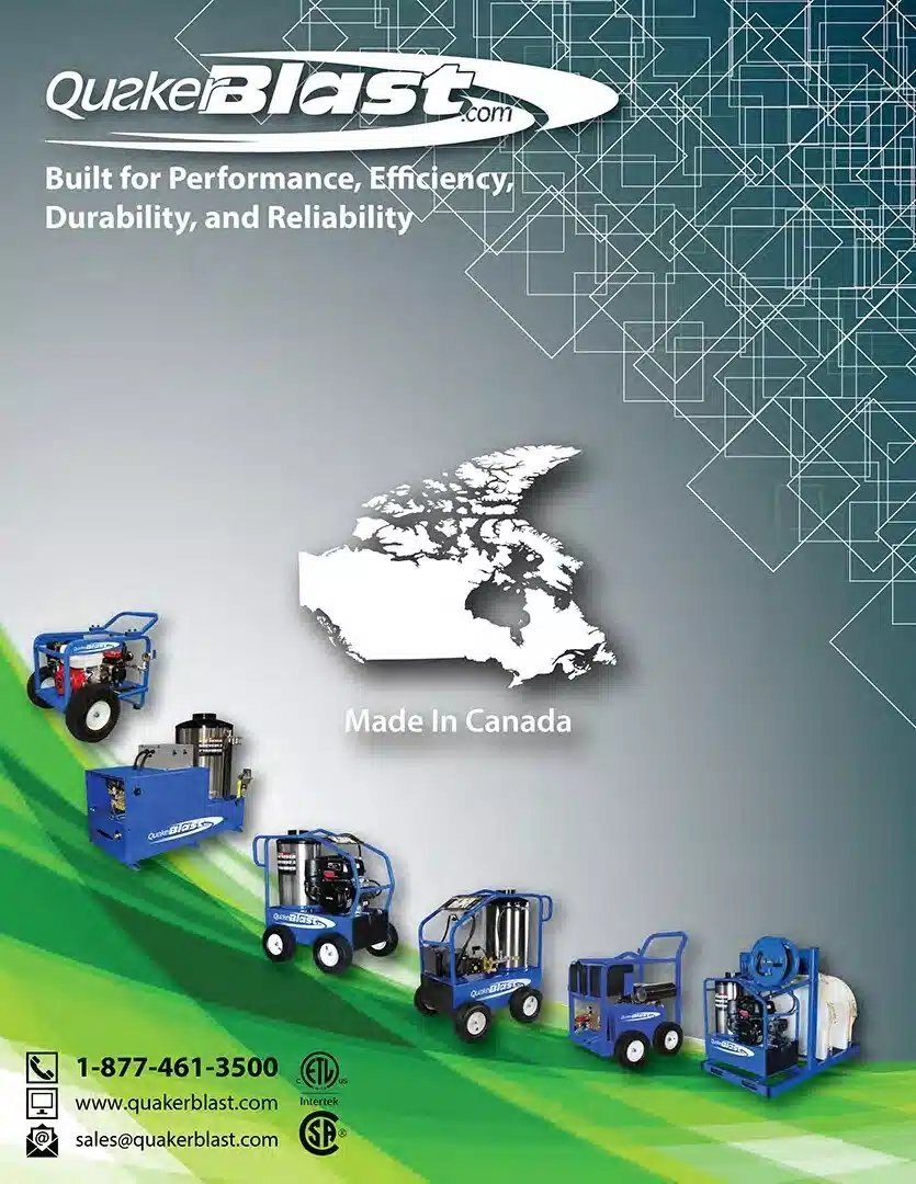 We are a full line Quaker Blast dealer. We currently have stock on the most popular Model Quaker 7 Hot water Diesel Fired Pressure washer. General Pump, 4000PSI, 3.5 GPM, 14HP Kohler Electric Start, 350000 BTU burner with Pneumatic Tires. Comes with 36" gun and wand and 50' of hose. we have been selling these units for 10 years they are Canadian Built product