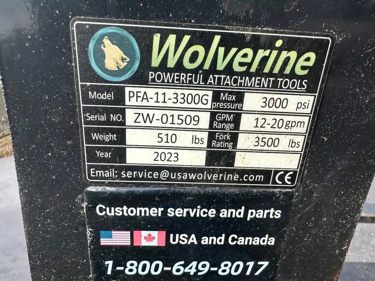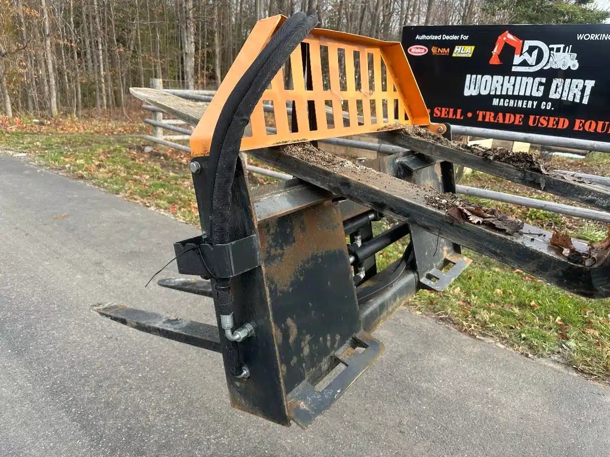 Skid steer pallet fork that has Hyd Adjustment with 42" tines 3500 lbs cap Like New. save 1000 over brand new