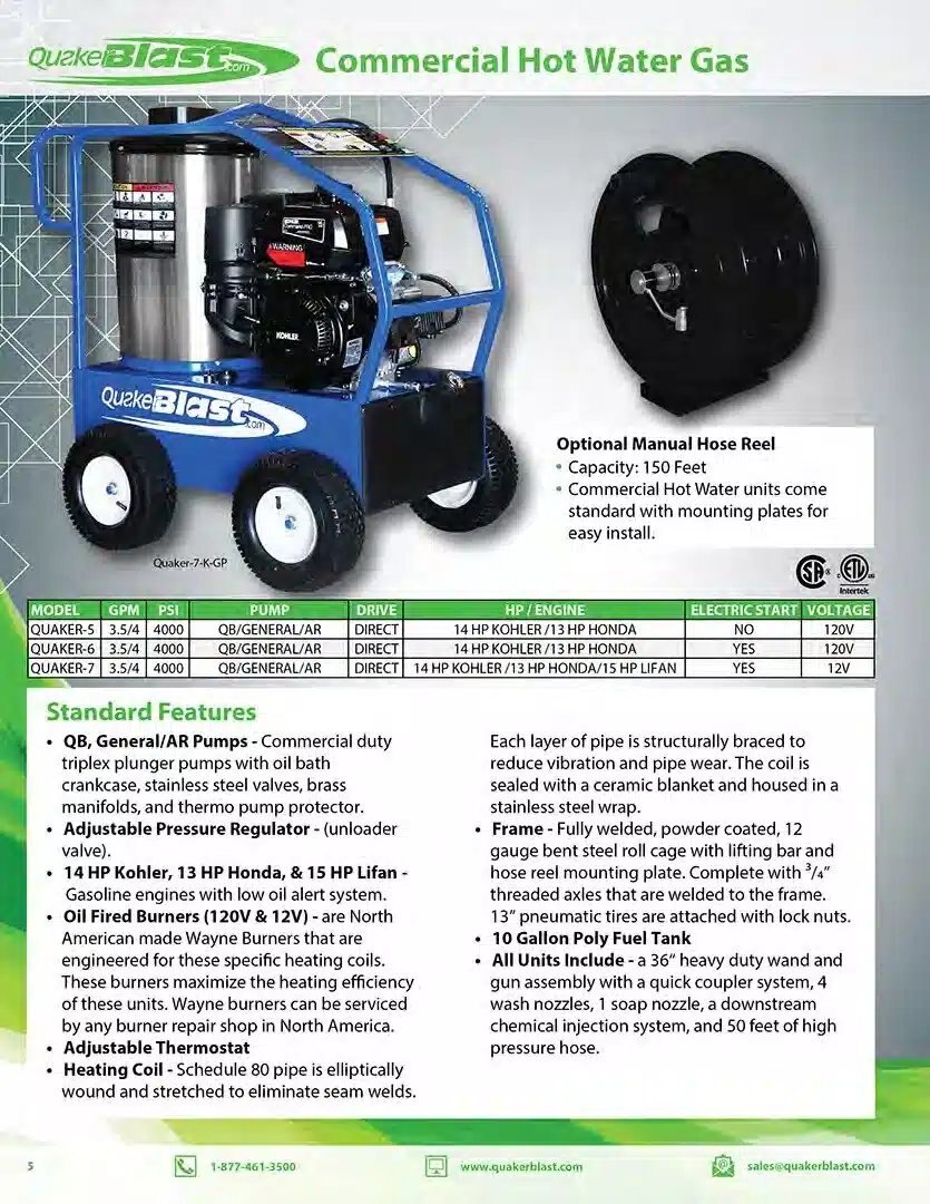 We are a full line Quaker Blast dealer. We currently have stock on the most popular Model Quaker 7 Hot water Diesel Fired Pressure washer. General Pump, 4000PSI, 3.5 GPM, 14HP Kohler Electric Start, 350000 BTU burner with Pneumatic Tires. Comes with 36" gun and wand and 50' of hose. we have been selling these units for 10 years they are Canadian Built product